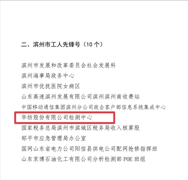 近日,濱州市總工會印發(fā)“關(guān)于濱州市五一勞動獎?wù)潞蜑I州市工人先鋒號的通報”,對華紡股份有限公司檢測中心等“濱州市十佳建功立業(yè)標(biāo)兵崗”的集體,授予“濱州市工人先鋒號”榮譽稱號。
